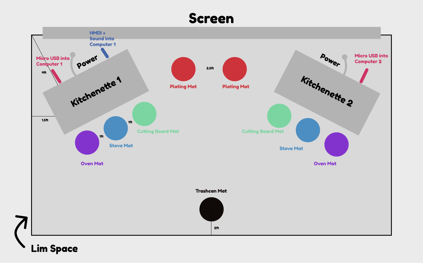 Ingredients will randomly spawn around the space on screen. In order to collect an ingredient players must run to the location and have their player collide with the ingredient. The player then must bring the ingredient to the appropriate "cooking station."